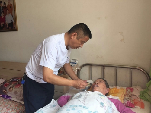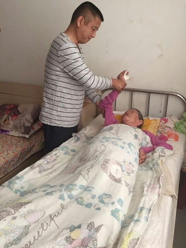 在母親剛出車禍的日子里,朱松在醫院的重癥監護室門口鋪上墊子,守了兩個多月,看母親實在沒有醒過來的可能,半年后就把母親搬到了家中靜養。常言說:“百天里頭無孝子”,可他卻做到了“百天里頭有孝子”,46的他像個“小老頭”,頭發花白,身心疲憊,顯得比同齡人大了許多、老了許多、衰了許多。在這近14年多的日日夜夜里,他除干好自己的工作外,精心地照顧著自己的母親,最難過的還是母親是一日三餐,母親不會嘴嚼,他就把母親所進的食物搗粹做成面糊,再一勺一勺地、小心地送進嘴里,一天要吃十多次,甚至更多;每天按時為母親清理大小便,一天下來要換好多塊尿布,就這樣他不嫌臟,不嫌累,為母親清理身上的糞便,像侍候小孩一樣精心地呵護著;由于母親常年躺在床上,每天都要為她捏捏腿,伸伸胳膊,一天按摩的遍數都數不清了,就這樣日復一日,年復一年地為母親端屎端尿,洗臉按摩。