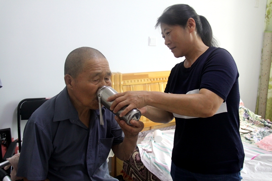 2012年底,公公的腦血栓復(fù)發(fā)了,盡管意識(shí)仍然清楚,但行動(dòng)已不便,如今只能推著小車走路了。公公今年80歲了,每天需要吃8種藥物。每次吃藥,丁延萍先數(shù)好,放在勺子里拿給老人看一看,老人確認(rèn)過(guò)再喂他吃下去。為了能夠在照顧老人和上班工作之間協(xié)調(diào)好,每天早晨五點(diǎn)多丁延萍就起床了,燒水、煮粥、伺候老人吃早飯。每天中午、晚上兩頓飯,都要保證炒兩個(gè)菜,做一個(gè)湯。老人容易便秘,丁延萍總是把湯里的蔬菜盡量撈給老人吃!白隽怂粣(ài)吃的,就吃得少,所以每次做飯之前我都問(wèn)問(wèn)他想吃啥,家里沒(méi)有的我就出去買!倍⊙悠颊f(shuō)。