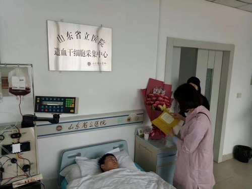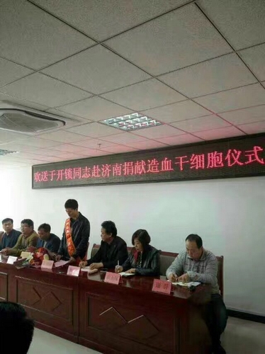 2015年6月19日,在巨野佳和的獻(xiàn)血車(chē)上,于開(kāi)鎖在獻(xiàn)血的過(guò)程中了解到骨髓捐獻(xiàn)的相關(guān)知識(shí)后,又無(wú)償捐獻(xiàn)了骨髓造血干細(xì)胞血樣,成為了一名光榮的中華骨髓庫(kù)志愿者。去年10月份,紅十字會(huì)第一次聯(lián)系于開(kāi)鎖,于開(kāi)鎖與一名四川的白血病患者低分配配型成功。今年年初,在紅十字會(huì)的聯(lián)系下,于開(kāi)鎖再次去巨野佳和獻(xiàn)血車(chē)上采集血樣,做進(jìn)一步的高分配配型,造血干細(xì)胞配型成功率較低,僅為萬(wàn)分之一甚至幾十萬(wàn)分之一,值得慶幸的是,于開(kāi)鎖和這位患者配型成功,這是于開(kāi)鎖的榮幸,也是這名患者的榮幸。由于家人對(duì)造血干細(xì)胞捐獻(xiàn)只是不太了解,害怕捐獻(xiàn)后對(duì)身體有不利影響,于開(kāi)鎖同志一面積極配合調(diào)整身體,一面做家庭的工作,征得家人的理解。2017年3月于開(kāi)鎖去菏澤省立醫(yī)院作進(jìn)一步全身檢查,據(jù)于開(kāi)鎖說(shuō),檢查項(xiàng)目很細(xì),尤其是抽血化驗(yàn),抽了很多管,比任何一次常規(guī)檢查都多。4月5日上午,在巨野縣的衛(wèi)生和計(jì)劃生育局隆重召開(kāi)歡送會(huì),歡送于開(kāi)鎖同志赴濟(jì)南山東省立醫(yī)院捐獻(xiàn)造血干細(xì)胞,挽救白血病患者生命。在省立醫(yī)院期間,4月6日、7日、8日、9日,每天早晚各一針動(dòng)員針劑。4月10日早上8點(diǎn)45到中午12點(diǎn)15,于開(kāi)鎖接受了將近四個(gè)小時(shí)造血干細(xì)胞的采集,捐獻(xiàn)了200毫升造血干細(xì)胞。由于對(duì)方患者體重較大,200毫升很可能不夠用。4月11日早上9點(diǎn)10分至中午12點(diǎn)35,于開(kāi)鎖又進(jìn)行了第二次造血干細(xì)胞的捐獻(xiàn),再次捐獻(xiàn)190毫升的造血干細(xì)胞。當(dāng)天下午四點(diǎn),在四川,將這批“生命的種子”移植到患者身上。