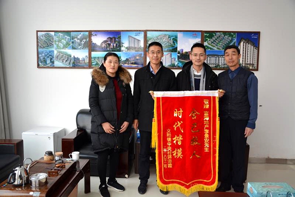 2018年2月8日,一位老人和一位婦女帶著一面書寫著“舍己為人,時代楷!卑藗燙金大字的錦旗來到富海地產辦公室,感謝李景安同志的救命之恩。原來,2017年12月30日中午12時30分許,河口區義和鎮中夾村的蔣海霞載著下課的兒子騰騰往家走,沿河民路由東向西行駛時開車走神,汽車失去控制翻入路邊河里,四輪朝上。