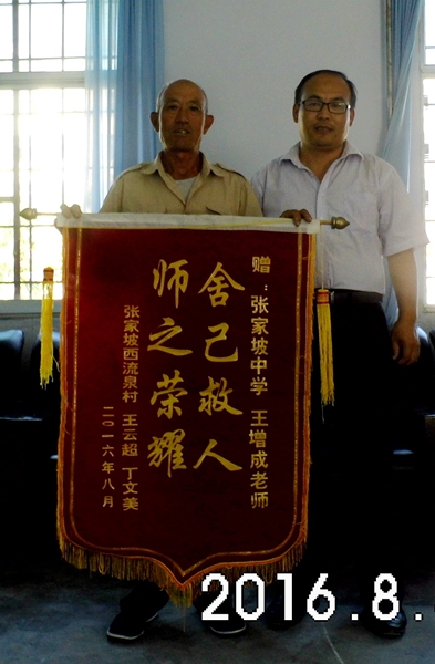 當家長從王增成老師的手中接過安全脫險的孩子時,十分高興。而此刻的王增成老師,卻不聲不響地離開了現場。暑假開學后,孩子的家長找到了學校,給王增成老師送去了感謝信和錦旗,孩子的家長對學校負責人言明,他一定要對王增成老師表達他的謝意時,王老師的救人事跡這才得以讓大家知曉。