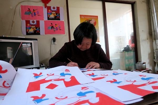 去年八月,王均花加入到嵐山區婦聯組織的農民畫制作活動中。“晚上閑著,時間也浪費了,畫農民畫怎么也能添補添補。底版是他們的,我們涂上顏色,一張幾塊錢的加工費。”王均花說,“我笨得不行,經過好幾次培訓,第一次交了150張,沒一張合格的。問老師,老師說我上色不均勻。”