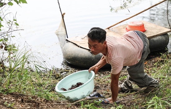 只見鑒高峰雙手上套著一雙破舊拖鞋,四肢著地,從小船上爬下來后,推著要裝小龍蝦的盆子,緩慢的在池塘邊爬行,就這樣慢慢尋找、收獲龍蝦。