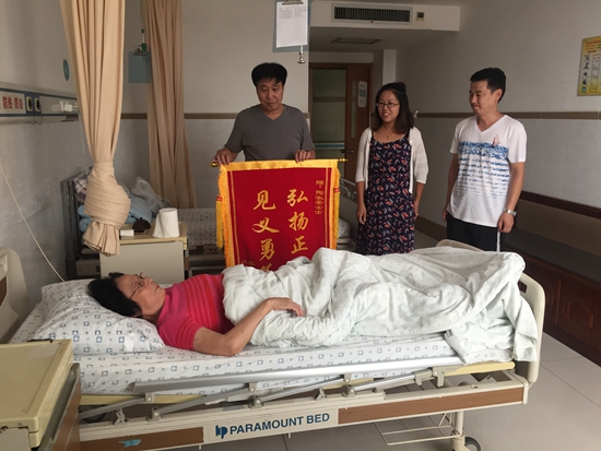 祖孫三人獲救了,但陶淑安的雙腿受傷,無法動彈,就在這時,她還不忘安撫受驚大哭的龍鳳胎孩子,讓張女士快帶孩子離開,不要嚇壞孩子。隨后,陶淑安被救護車送往醫院。經過檢查,陶淑安右腿韌帶斷裂,立即進行了手術。被救孩子的父母為陶淑安老人送錦旗表示感謝,躺在病床上的陶淑安話語不多,臉上流露著和藹的笑容,很難讓人將眼前這名60歲的老人與見義勇為想到一起。但就是這樣一位整日操持家務的普通老人,卻在危急時刻伸出援手,讓人敬佩。
