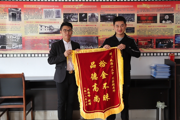 “真是太感謝了。”16日上午,朱海峰手里拿著在合肥定制的錦旗,趕到威海市第十三中學(xué)。見(jiàn)到劉宗超老師后,他急步上前握住劉老師的手,激動(dòng)地說(shuō),劉宗超老師真是太善良了,能夠把錢全部還給他,他非常感動(dòng)。