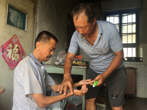 今年50歲的于春海,從生下的那一天起,生活便是無比的簡單,由于遺傳和治療不及時的緣故,于春海的智力一直停留在一個2、3歲的小孩子水平,缺乏對生活最基本的認知,除了吃飯之外,日常生活基本離不開人的照顧。每天就是吃飯和坐著,同時,還患有嚴重的皮膚病和乙肝,需要藥物治療。而在劉明舉的生活里,除了日常工作之外,便只剩下陪伴著于春海。于春海全身患有嚴重的皮膚病,需要藥物治療。前幾年家庭生活比較拮據,劉明舉求爺爺告奶奶,向別人求到了對于一般家庭還是很廉價的治療皮膚病的藥物,每天幫于春海進行全身的涂抹。不管嚴寒酷暑,兩個人都要坐在家里為了“涂藥”這個事進行一番抗爭。由于皮膚病,每次涂藥的時候,于春海都因為皮膚接觸而疼得發狂。隨著歲數的增長,劉明舉越來越感到力不從心,每到劉明舉無法將于春明按住的時候,兩個大老爺們便抱在一起哭一會兒,你埋怨我一陣,我罵你一陣,然后等疼痛消弭之后繼續下一輪的抗爭,這一抹便是20多年。