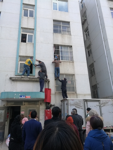 隨后,鄰居羅忠生將一輛廂貨車倒到樓下,幾位鄰居和路人爬上去,從另一個方向去托住孩子。托住孩子的幾個人互相之間大都不認識。孩子哭叫的聲音越來越弱,下面幾個人的心越揪越緊,就商量著一直托舉著也不是辦法,最后協力慢慢將孩子側過身來,最終透過護欄,將孩子推進了房間里。從發現孩子到將孩子推進房間,整個過程持續了半個多小時。
