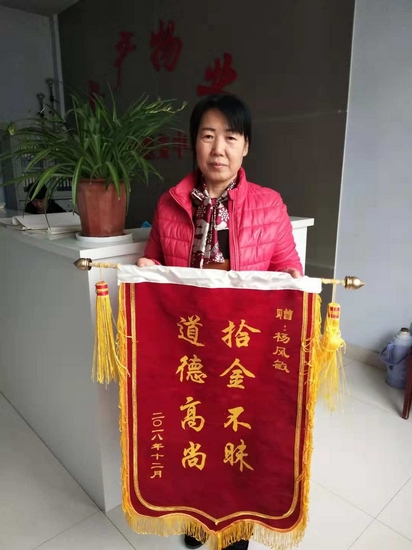 她們將身份證上的姓名與小區住戶逐個查對,翻看42棟樓的業主信息檔案后未查到對應人員。根據以往的經驗,業主們丟失物品,也會第一時間和物業辦公室聯系。確認了失主不是小區住戶,她們立即向街道派出所尋求幫助,在民警的多方努力下,終于找到了失主。12月7日失主將繡有“拾金不昧、道德高尚”和“物業好管家、居家好鄰居”的兩面錦旗送到物業辦公室向楊風敏表示感謝。面對失主的連聲道謝,憨厚樸實的楊風敏反而顯得很不好意思,她說:“這是應該的,換成誰也會這樣做!