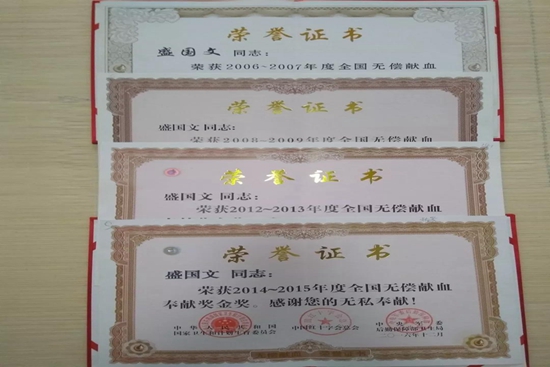 盛國文經(jīng)歷了40年的獻(xiàn)血?dú)v程,202次無償獻(xiàn)血,共獻(xiàn)血96400毫升,影響帶動(dòng)了400多人參加到無償獻(xiàn)血中去,志愿服務(wù)累計(jì)近4000多小時(shí),四次榮獲“全國無償獻(xiàn)血奉獻(xiàn)獎(jiǎng)金獎(jiǎng)”,兩次榮獲“全國無償獻(xiàn)血志愿服務(wù)獎(jiǎng)五星獎(jiǎng)”。