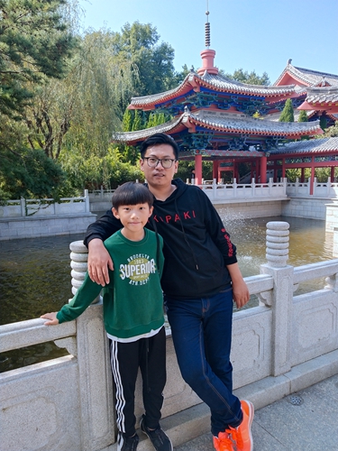 2018年10月1日,紀(jì)曉鳴與兒子在威海旅游。