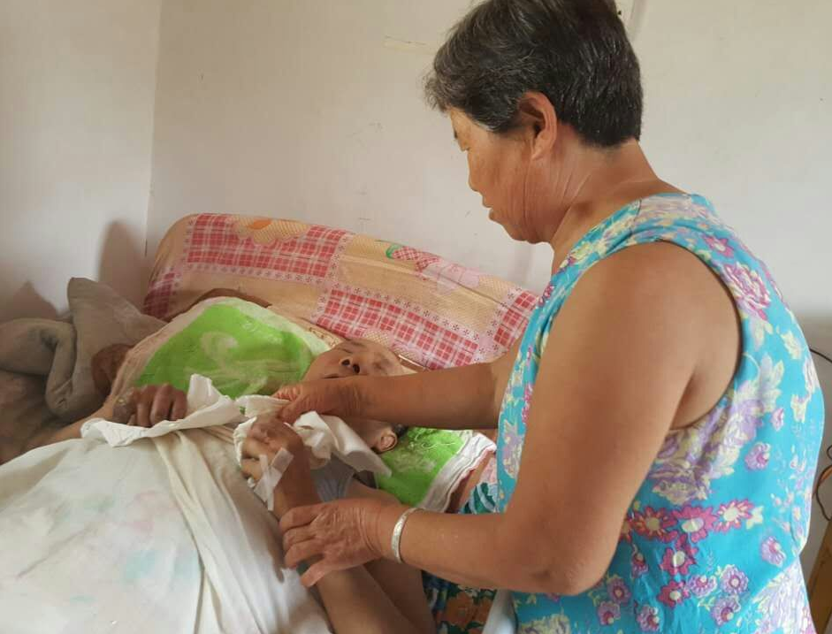 一進胡現蘭的家就看到整潔而又整齊的院落,干凈的雞棚里有幾只母雞在悠閑的進食,如果不是緊閉的破敗的堂屋以及晾衣繩上滿滿的成人尿布,你根本不會想到這個家有個癱瘓二十余年的病人。“二十五年多了”提到癱瘓在床的老伴,胡現蘭陷進了回憶中。她告訴記者,1993年,丈夫李國真義務出工去修路,下晌回來時因為腦干出血,癱倒在離家幾米的胡同口,再也站起來……說到這里,胡現蘭悄悄的抹了一把眼淚。