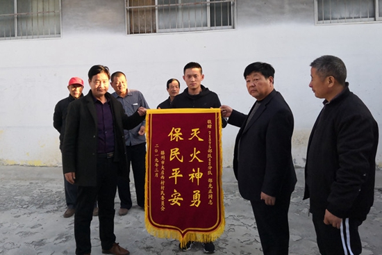 “19號那場火情,多虧了你們村的小伙子邵光正鼎力相救,要不是他,我們村農(nóng)戶家的樓房不知會被燒成啥樣子,大家都很感激他!”3月21日上午,姜屯鎮(zhèn)大彥西村黨支部書記張世文和幾個村民將一面印有“滅火神勇,保民平安”的錦旗送到大塢鎮(zhèn)邵莊村,這時大家才知道邵莊村小伙子邵光正救火的事情。