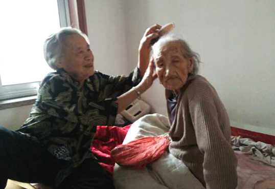 有高齡的老人家里一般都有異味,走進潘寶玉家,干干凈凈整整齊齊,一點異味也沒有,單從這一點足以看出潘寶玉在伺候老人無微不至。老人坐在炕上,意識很清醒,但言談吐字不清,只有潘寶玉能聽得懂。正趕上老人小便,潘寶玉已是80歲的人了,滿頭銀發,背已駝、腰已彎,但是用嫻熟的動作抱起婆婆,輕輕地放在自制的馬桶上,小便后又吃力地把婆婆慢慢抱到炕上,氣喘吁吁卻笑意盈盈,敬佩之情油然而生。