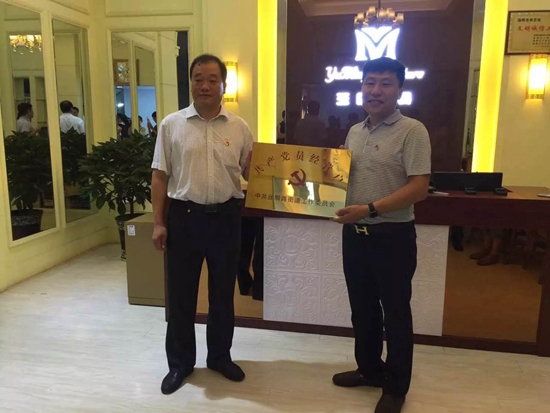2016.7.12耿玉明(右) 接受周村區絲綢路街道蘇書記為公司頒發的“共產黨員經營戶”牌匾