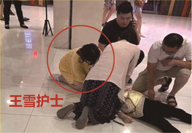 2019年8月18日周日晚上,王雪和家人去商場就餐時(shí),聽到鄰桌小女生告訴她媽媽“外面有人暈倒了!”。王雪立刻出去查看,當(dāng)時(shí)見一名女子平躺在地上,王雪解釋自己是一名護(hù)士,便立即靠近女子了解情況,當(dāng)時(shí)已觸不到女子的頸動(dòng)脈,她讓工作人員撥打120,并立即對女子進(jìn)行胸外按壓。
