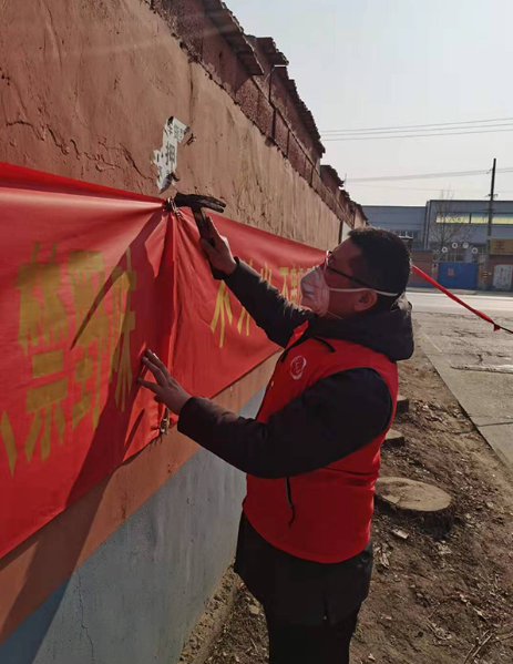 疫情知識(shí)宣傳、群眾安撫勸導(dǎo)是防控的基礎(chǔ)工作,但是迓莊村里許多老人不會(huì)用智能手機(jī)、不了解疫情的發(fā)展情況,趙劍就和村干部一邊入戶核查人員往來情況,一邊宣傳防護(hù)措施和告知最新疫情,叮囑村民要注意衛(wèi)生、不要串門。為此,趙劍走遍了村子里的大街小胡同,只為將疫情防控知識(shí)傳達(dá)給每一位村民。與此同時(shí),趙劍還充分運(yùn)用村內(nèi)喇叭、全村微信群廣泛宣傳疫情防控倡議書、疫情通告、病毒防控指南等材料,在村內(nèi)顯著位置懸掛起一道道橫幅、張貼倡議書。村民看到第一書記沖鋒在前,恐慌緊張的心情也就平復(fù)下來。趙劍和迓莊村“兩委”第一時(shí)間成立了疫情防控工作小組,組建了迓莊村抗擊疫情志愿服務(wù)隊(duì)。在村內(nèi)各個(gè)路口設(shè)立了疫情防控檢查站,他和村干部帶頭值守在檢查站,對進(jìn)出村人員和車輛進(jìn)行嚴(yán)格管控和登記,入村人員逐個(gè)測體溫,車輛逐個(gè)進(jìn)行消毒處理。為了盡最大所能防止疫情,趙劍和志愿者用84消毒液及時(shí)對村內(nèi)小賣鋪、衛(wèi)生室、廣場健身設(shè)施等進(jìn)行徹底的消毒工作,確保掐斷病毒進(jìn)入村莊的源頭,為迓莊村構(gòu)筑起了群防群治的嚴(yán)密防線。