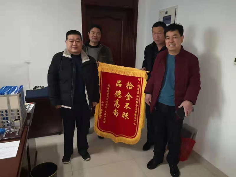 1月20日,失主王先生與他們書記一起,將鑲有“拾金不昧 品德高尚”的錦旗送到劉森手中。