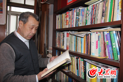 70歲的周寶存住在青島市南區中山路街道辦事處泰安路社區一棟居民樓的20多平米的小房內,這間房子已經陪伴他近30年了。冬天沒有暖氣,夏天沒有風扇,家里惟一的電器就是一臺14寸的老電視機,房子東西兩面墻擺放著高高的書架,一張單人床、簡易的小桌、數千冊書就是他的全部家當。