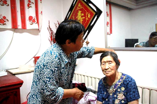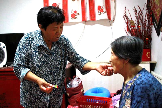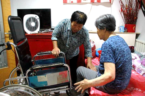 6年前,婆婆安玉桂患上了腦血栓,患病第二天不小心跌了一跤,把右腿骨頭跌壞了,從此就再也不能自己下地走過,只能坐輪椅,彼時的崔合倫也患了直腸癌,動了一場大手術,腹部造瘺掛袋,兩天一換,十分遭罪,身體也大不如以前,再加上家里還有98歲的老母親需要照顧,崔合倫仍然沒有拋棄自己的婆婆,侍奉婆婆穿衣吃飯,端屎端尿。看著崔合倫那么累,婆婆也很是心疼,實在是不忍心兒媳這么辛苦,主動提出去閨女家住幾天,讓媳婦也好好休息休息。可是沒多久,崔合倫就又把婆婆接回家來照顧。“俺跟俺婆婆就跟親媽一樣,跟小姑子們也像親姐妹一樣好。”崔合倫說,現在和小姑子們一起輪流照顧,但是婆婆還是喜歡在自己家,與她“母女”兩個相伴。