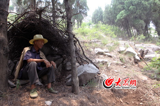 四年的時(shí)間里,他吃過早飯只身上山,不分春秋冬夏。冬季寒冷刺骨,夏季烈日炎炎,盛夏暴雨天氣是常有的事情。雨季來臨,他滿身淋得濕漉漉的。自打一次突如其來的暴雨把他淋得措手不及之后,在半山腰,馬道沁就在山腰森林處用樹枝搭建了一個(gè)臨時(shí)的窩棚,上面蓋著柴草和塑料布,用于避雨休息。他給窩棚起了名字,“樂在其中”幾個(gè)大字,抒發(fā)了自己的情感。下雨時(shí),眼前漫山水霧白茫茫一片,他便藏身在這處山林間的小窩棚里悠然觀山聽雨。