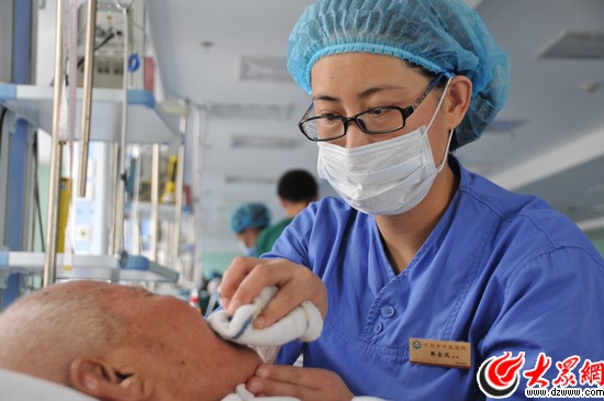 大眾網(wǎng)濟(jì)南9月16日訊(記者 于瀟瀟)ICU又稱重癥監(jiān)護(hù)室,這里集中了醫(yī)院里病情最重、最危急的病人,需要時刻有人看護(hù)。在日照市中醫(yī)醫(yī)院腦病三科重癥監(jiān)護(hù)室(ICU)里,護(hù)士郭金鳳已經(jīng)工作了8年多,把自己的青春獻(xiàn)給了ICU這一特殊的護(hù)理崗位。