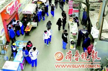 [提要] 濟(jì)南桿石橋附近的一條小巷子里,午餐時(shí)間小吃攤前擠滿身穿校服的學(xué)生。記者了解到,除了少數(shù)寄宿制高中,濟(jì)南市多數(shù)學(xué)校都沒(méi)有食堂,“管理困難、風(fēng)險(xiǎn)大、校園狹小”是學(xué)校不配套食堂的主要原因。