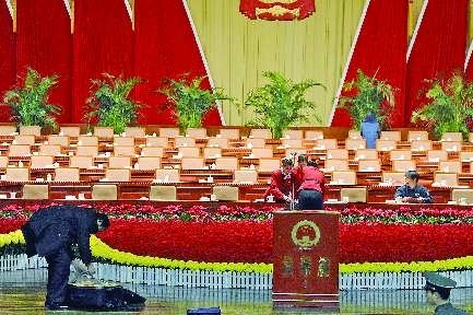 17日下午,省十一屆人大四次會議閉幕。圖為大會閉幕后,工作人員整理大會會場。 本報記者 王媛 攝