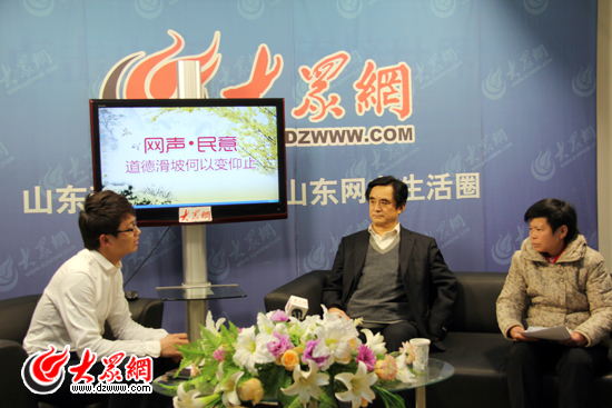 從“小悅悅”事件到“老人摔倒無(wú)人敢扶”,從“毒奶粉”、“地溝油”到“瘦肉精”,如今的社會(huì)是否已經(jīng)進(jìn)入了“道德滑坡”的時(shí)代?這種道德的“滑坡”如何變?yōu)椤把鲋埂保俊皟蓵?huì)”期間,大眾網(wǎng)《網(wǎng)聲·民意》欄目邀請(qǐng)到了省政府參事、省政協(xié)委員、山東大學(xué)儒學(xué)高等研究院教授馬來(lái)平和全國(guó)道德模范提名獎(jiǎng)獲得者、省道德模范張業(yè)愛(ài),并現(xiàn)場(chǎng)與龍口“最美女孩”刁娜連線。委員、道德模范共談如何如何抑止“道德滑坡”現(xiàn)象。