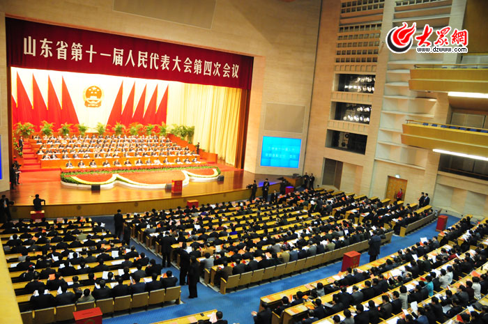 大眾網濟南2月17日訊(記者 曹亮 隋喬 韋輝) 今天下午,山東省十一屆人大四次會議完成各項議程在濟南勝利閉幕,圖為閉幕大會現場。
