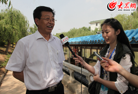 聊城市委常委、宣傳部長(zhǎng)趙慶忠接受采訪團(tuán)記者采訪,并介紹了聊城市在“水城”建設(shè)方面所做的工作。(盛堃 攝影)