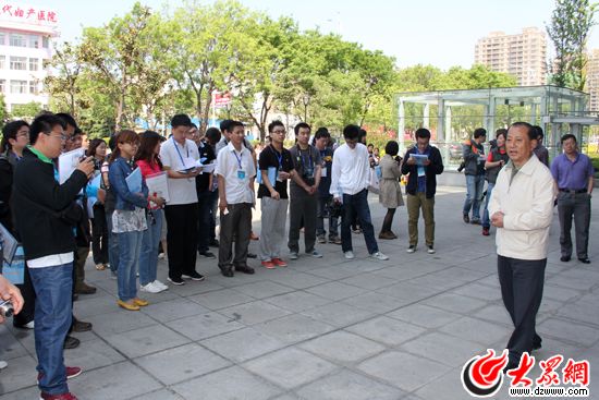 采訪團在威海市民文化藝術中心聽取威海市委宣傳部副部長錢啟民的介紹。(馬鑫 攝)
