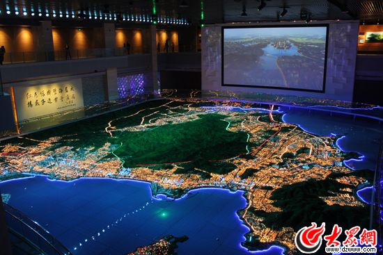 采訪團參觀威海市市民文化藝術中心里的規劃館。(馬鑫 攝)