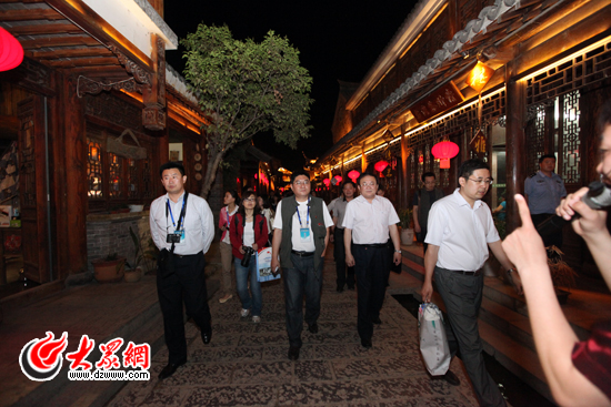 領導及采訪團記者一同夜游臺兒莊古城。(盛堃 攝影)