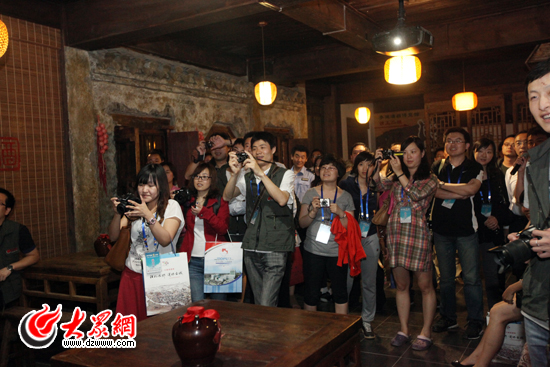 臺兒莊古城內的酒文化展館引起記者們的興趣。(盛堃 攝影)