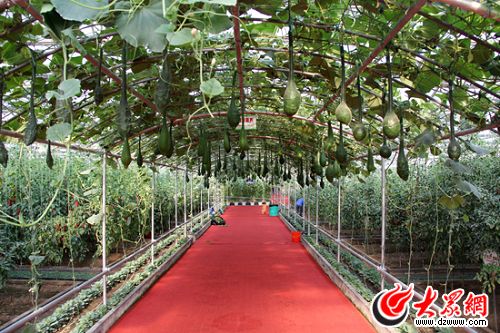 無“土”生金、獨“樹”成林、萬“果”同根,一走進展示大廳,眾多的蔬菜藝術品立刻讓人眼花繚亂。一棵棵綠油油的蔬菜整齊地“長”在管道、廊架上和展示池中,按比例配好的營養物質放進水里便融化成營養液,管道則把這些營養液輸送給植物根系,只需要給它點陽光。據了解,由于蔬菜在土壤中連年種植后,積累的鹽分和根結線蟲等病蟲害對作物根系的危害很大,而無土栽培便有效地解決了重茬問題。像這種“水培”模式不僅不會污染環境,而且使單位面積的產量至少提高5倍,由于營養直接充足供給,葉菜植物的生長期比在土壤里更短。