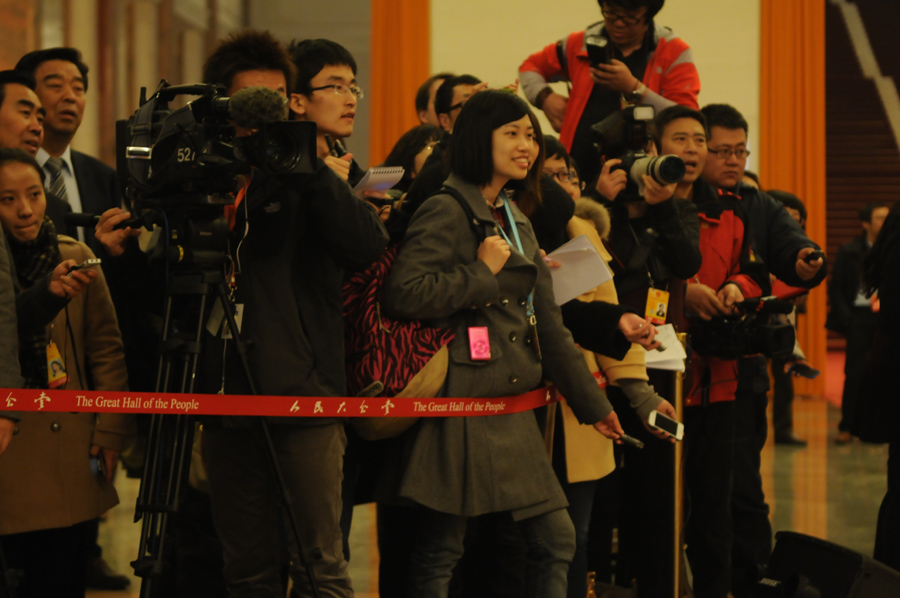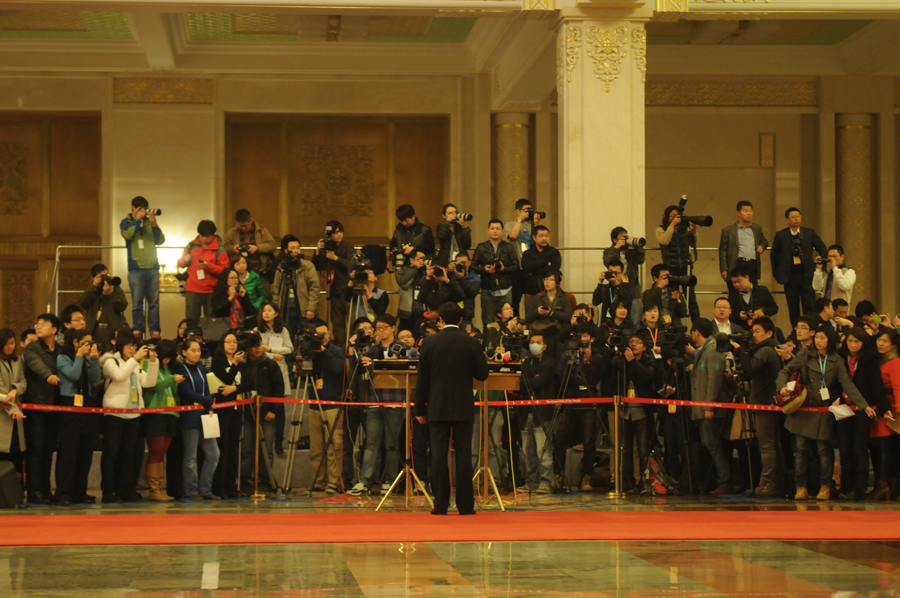 3月15日(星期五)上午9時,十二屆全國人大一次會議在人民大會堂舉行第五次全體會議,決定國務院總理的人選;決定中華人民共和國中央軍事委員會副主席、委員的人選;選舉最高人民法院院長;選舉最高人民檢察院檢察長。圖為記者拿著各自的裝備采訪部長。翟子赫 攝