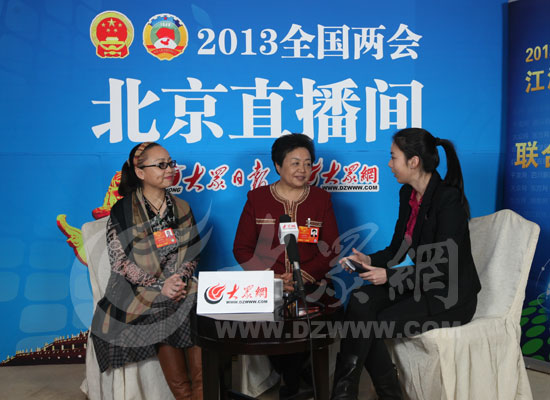 全國人大代表、曹縣磐石辦事處五里墩村黨支部書記、銀香偉業集團董事長王銀香(中)和全國人大代表、青島農業大學科技處副處長、山東布萊凱特黑?萍脊煞萦邢薰径麻L董雅娟(左)做客大眾網北京直播室(特派記者 韋輝 攝)