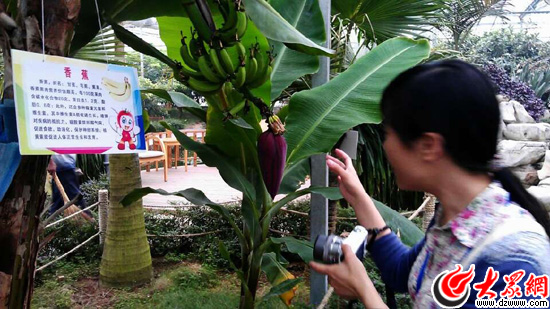 在花樣年華生態農業園的熱帶風情園區,記者被難得一見的南方水果香蕉深深吸引,紛紛用相機記錄下來。 (大眾網記者 尹海洋攝)