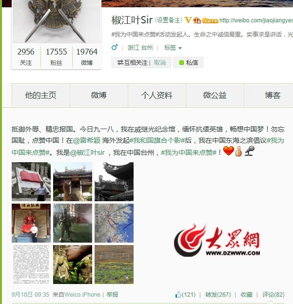 葉展源:#我為中國來點贊#是9月18日發起的,當時的倡議是:#我為中國來點贊#無論你在哪里?無論你在何行業?無論你年青陽光還是歷經風霜?你對于祖國都會有一份誠摯的感情!對身邊的精彩人物、英雄事跡、大好河山、燦爛文化都會有自己的看法!讓我們一起來#我為中國來點贊#!抵御外辱、精忠報國。今日九一八,我在戚繼光紀念館,緬懷抗倭英雄,暢想中國夢!勿忘國恥,點贊中國!在@雷希穎 海外發起#我和國旗合個影#后,我在中國東海之濱倡議#我為中國來點贊#。我是@椒江葉sir ,我在中國臺州,#我為中國來點贊#!