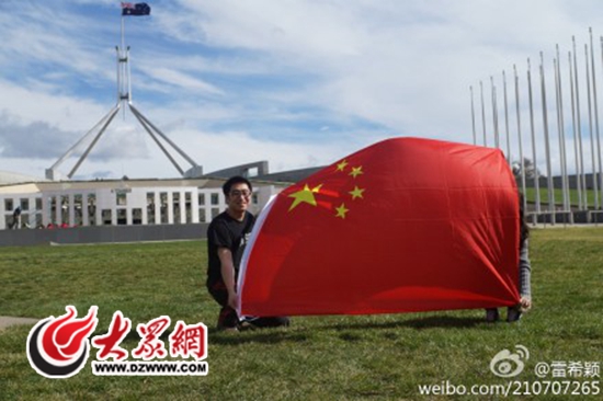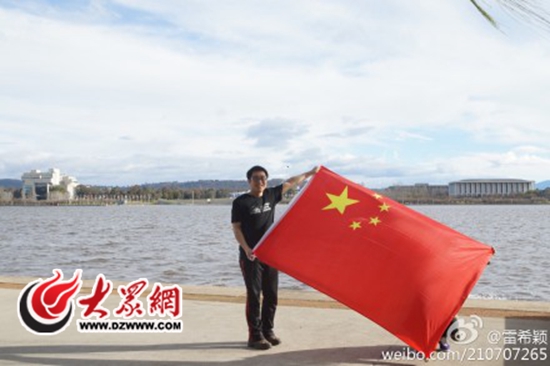 大眾網(wǎng)濟(jì)南10月1日訊(記者 劉明明)今天是祖國(guó)母親的65歲華誕,近段時(shí)間來(lái),“我和國(guó)旗合個(gè)影”活動(dòng)紅耀微博、微信,成為廣大網(wǎng)友表達(dá)愛(ài)國(guó)之情、為祖國(guó)“慶生”的方式。在短短二十幾天里,該話題的微博閱讀量已經(jīng)超過(guò)了2.3億,有近15萬(wàn)網(wǎng)友參與了話題的討論,大眾網(wǎng)也響應(yīng)發(fā)起了“我和國(guó)旗合個(gè)影 我為中國(guó)來(lái)點(diǎn)贊”的活動(dòng),得到數(shù)萬(wàn)山東網(wǎng)民的參與。近日,大眾網(wǎng)通過(guò)越洋電話,獨(dú)家采訪了遠(yuǎn)在澳大利亞的該話題的發(fā)起人@雷希穎 ,聽(tīng)他講述話題發(fā)起背后的故事。