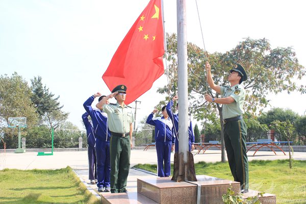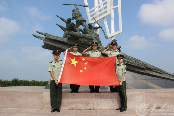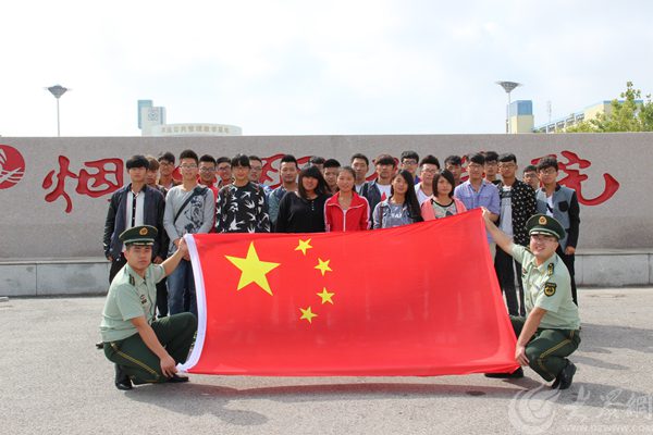 煙臺邊防官兵與煙臺職業(yè)技術(shù)學(xué)院大學(xué)生共同與國旗合影