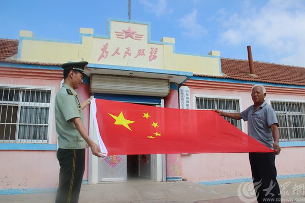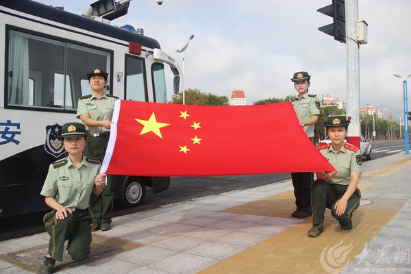 煙臺邊防官兵在流動警務(wù)室前與國旗合影