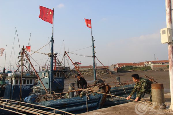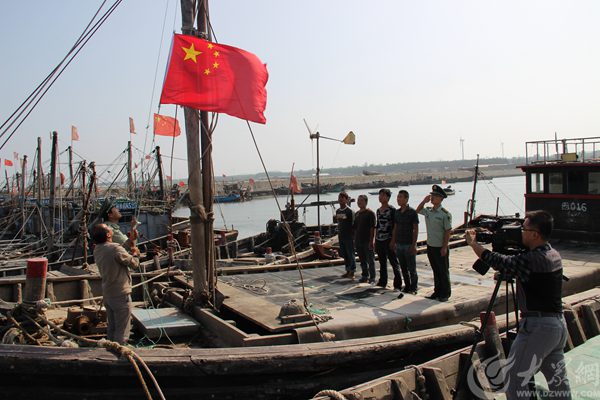 煙臺邊防官兵與漁民在漁船上升國旗