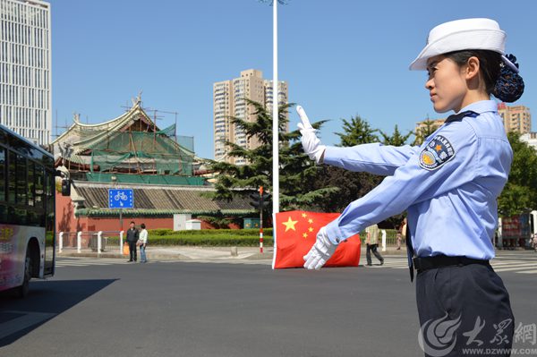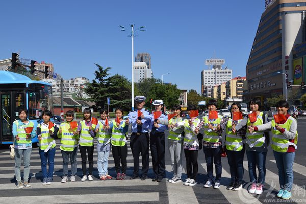國慶節(jié)將迎來交通高峰,煙臺大學(xué)文經(jīng)學(xué)院的交通志愿者們與交警一大隊(duì)民警手拿小國旗,共同為祖國點(diǎn)贊。