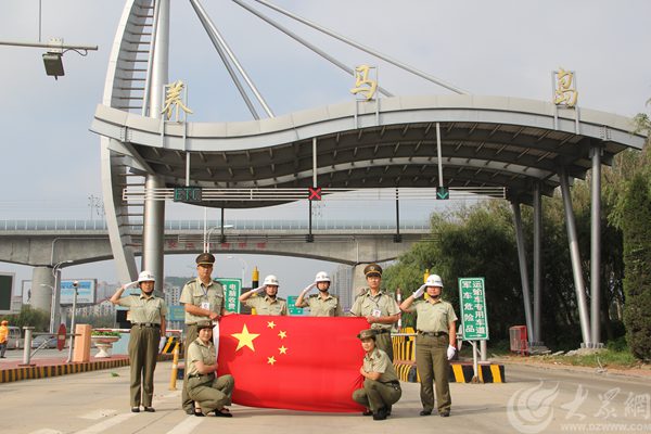 國慶前夕,馬龍公司煙臺管理處養(yǎng)馬島收費(fèi)站工作人員在收費(fèi)站前與國旗合影