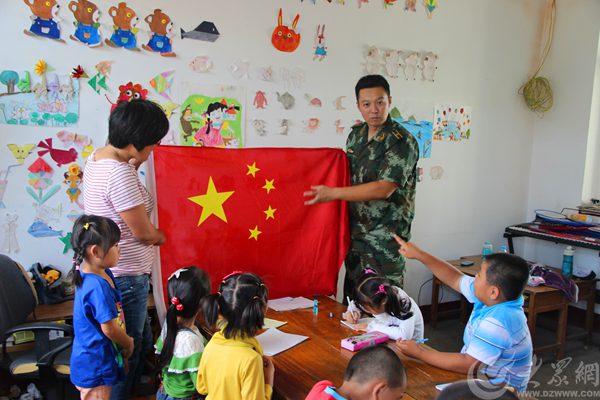 煙臺邊防官兵走進(jìn)校園,和小學(xué)生講解國旗的意義