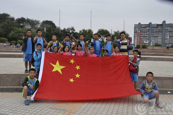 開發(fā)區(qū)天地廣場前,開發(fā)區(qū)第一實(shí)驗(yàn)小學(xué)籃球隊(duì)的學(xué)生剛打完一場比賽,在國旗前為祖國點(diǎn)贊。