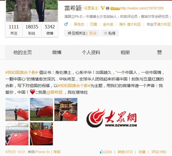 今天是祖國母親的65歲華誕,近段時間來,“我和國旗合個影”活動紅耀微博、微信,成為廣大網友表達愛國之情、為祖國“慶生”的方式。在短短二十幾天里,該話題的微博閱讀量已經超過了2.3億,有近15萬網友參與了話題的討論,大眾網也響應發(fā)起了“我和國旗合個影 我為中國來點贊”的活動,得到數(shù)萬山東網民的參與。近日,大眾網通過越洋電話,獨家采訪了遠在澳大利亞的該話題的發(fā)起人@雷希穎 ,聽他講述話題發(fā)起背后的故事。