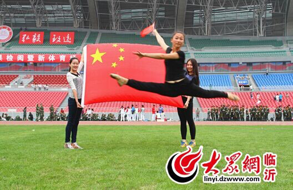 臨沂大學(xué)舞蹈學(xué)院大一新生陸遠(yuǎn)(左二)在臨沂大學(xué)體育場(chǎng),與國(guó)旗合影,用跳躍的一字馬為中國(guó)點(diǎn)贊。