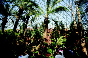 走進植物館沙生植物區(qū),仿照熱帶荒漠景觀營造的沙礫地貌上,矗立著高大挺拔的仙人柱、渾圓帶刺的仙人球、排排如扇的仙人掌。穿過這個區(qū)域,高大的加拿利海棗及中東海棗組群呈現(xiàn)于眼前,下方是由朱蕉、雪花木、孔雀木及蕨類等植物組成的灌木群。游客步入其間,就好像置身熱帶雨林,異域風情撲面而來。
